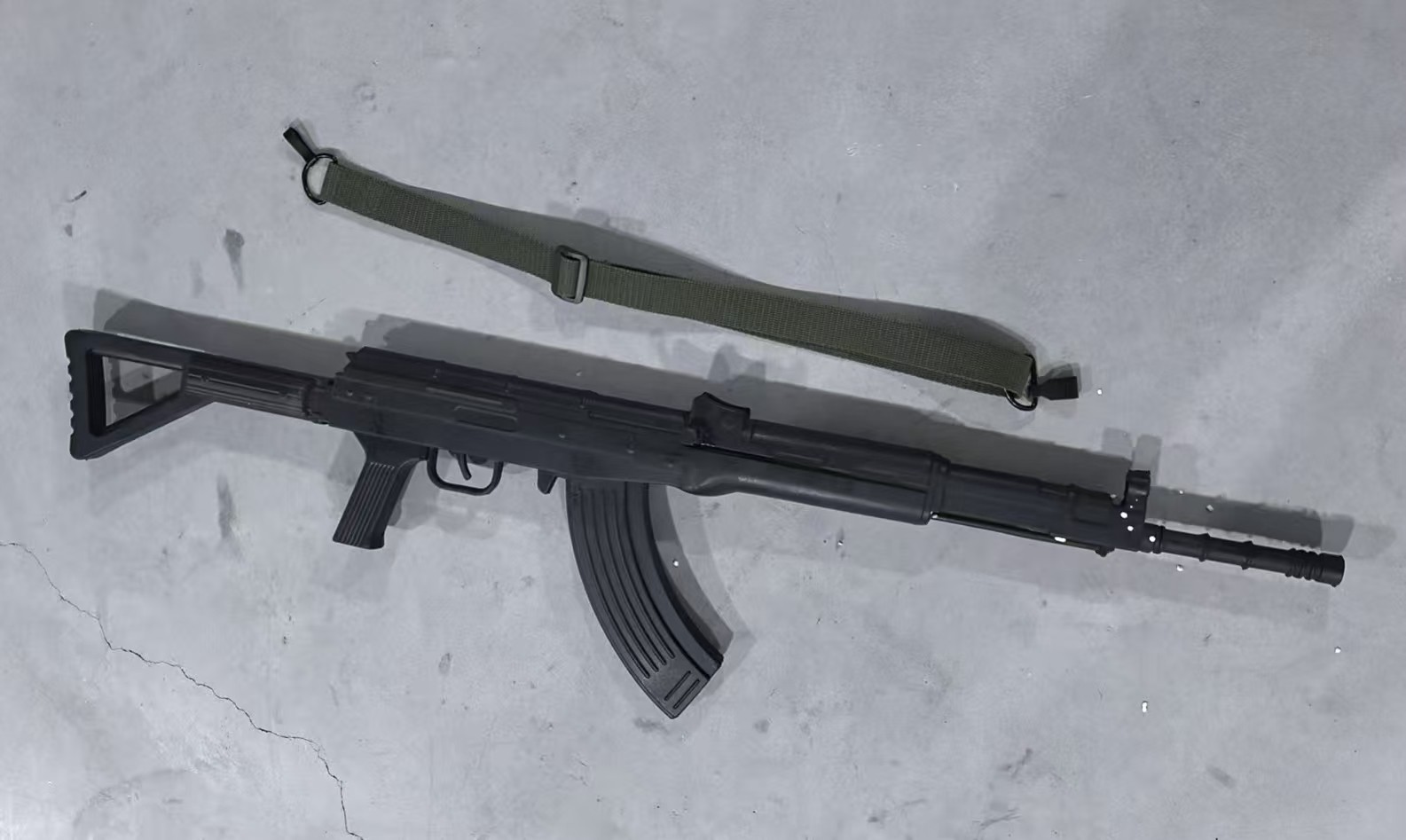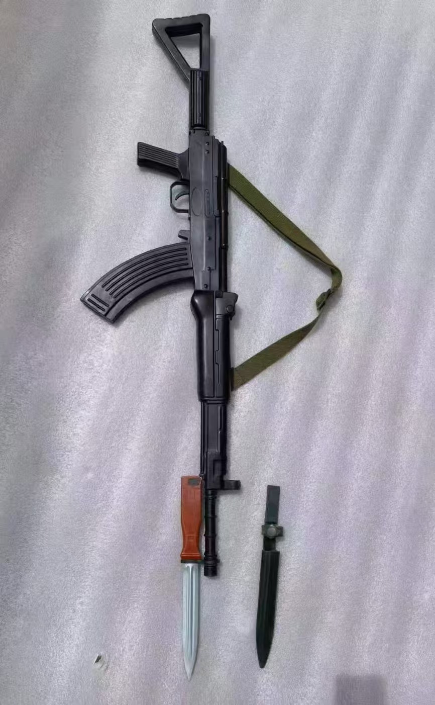 外壳采用天然橡胶,枪身内铸钢架配重、由高压机械模具一次性压铸而成、仿真1:1比例,板机可扣动,枪栓可拉动、弹夹可拆卸,配有军绿色背带;长750*宽360mm(误差±5mm左右),净重:3.45kg左右