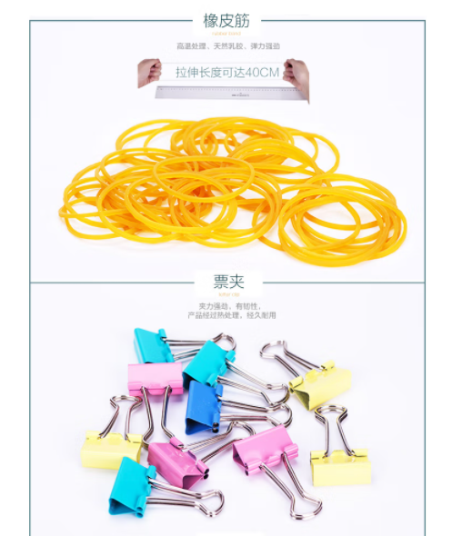 办公用品套装 得力(deli)四合一办公用品组合套装(19mm小号票夹10只+29mm回形针100只+工字钉50只+橡皮筋)/盒 8500